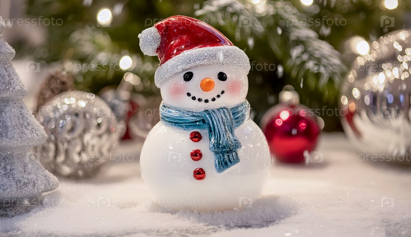Милый снеговик в красной шапке и синем шарфе стоит на фоне рождественской елки