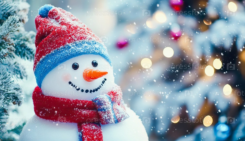 Милый снеговик в красной шапке и синем шарфе стоит на фоне рождественской елки
