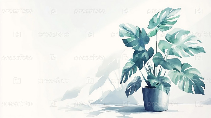 Монстера в горшке на белом фоне, акварельная иллюстрация. Сгенерировано ИИ