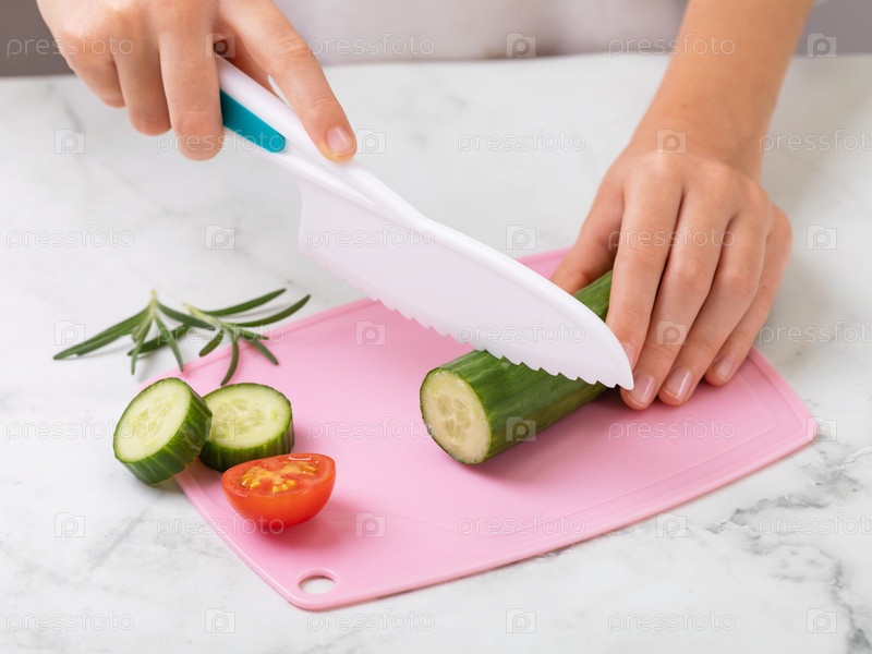 Ребенок режет огурец на кусочки пластиковым ножом на разделочной доске, подготавливает ингредиенты для салата