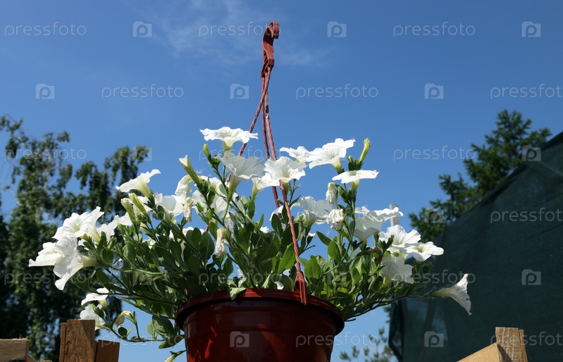 Белая петуния в подвесном горшке на фоне голубого неба