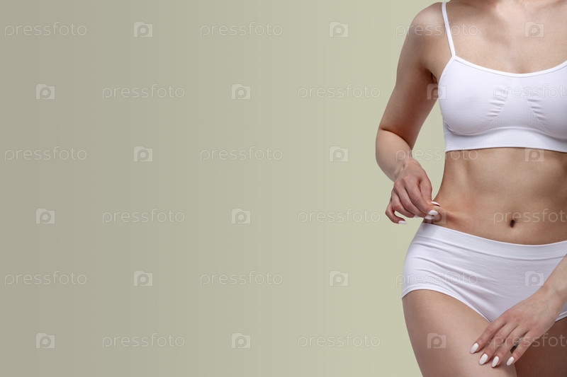 Женщина щипает жир на животе на пастельном фоне с местом для вашей информации