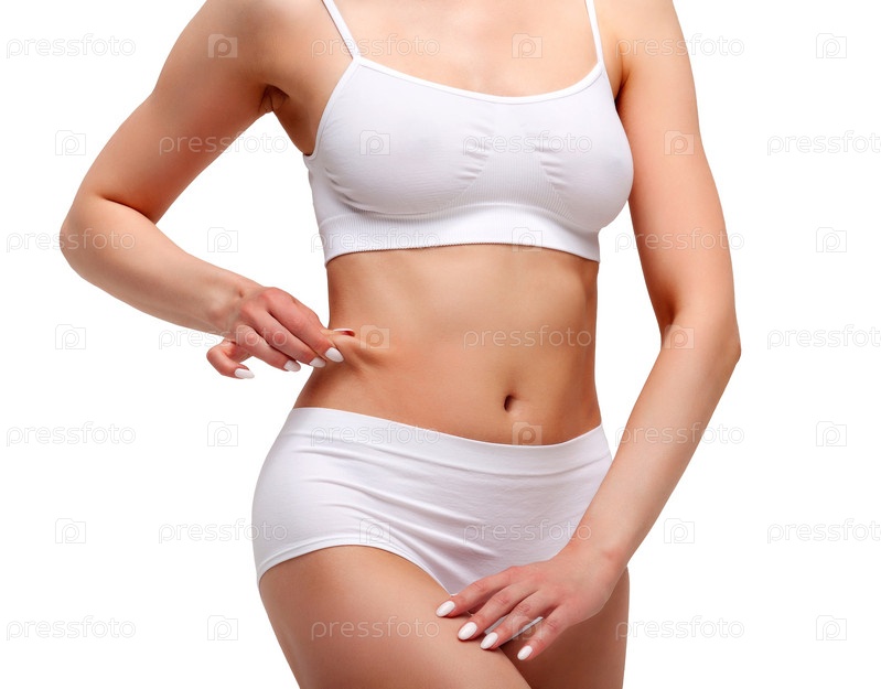 Женщина ущипнула жир на животе, снимок крупным планом