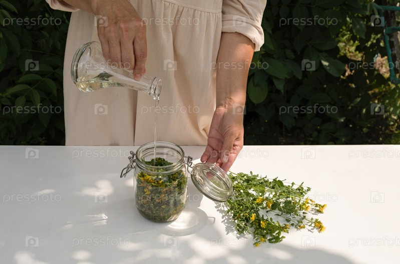 Процесс приготовления лечебного масла из цветков зверобоя. Концепция траволечения и альтернативной медицины