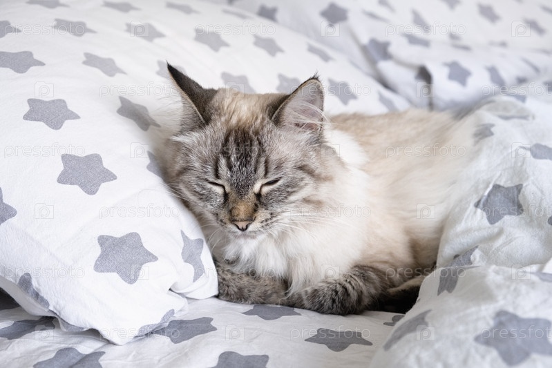 Невская маскарадная кошка спит на подушке под одеялом. Крупный план