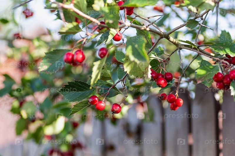 Ветвь, полная красных ягод баклажана в начале осени. Ягоды баклажана. Crataegus monogyna