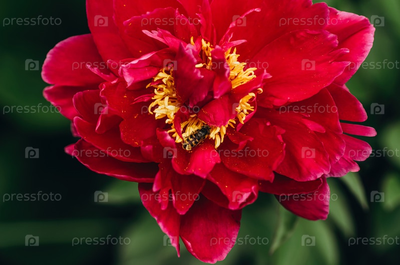 Крупный план красного цветка пиона с осой на желтых тычинках. Опыление, цветущие садовые растения