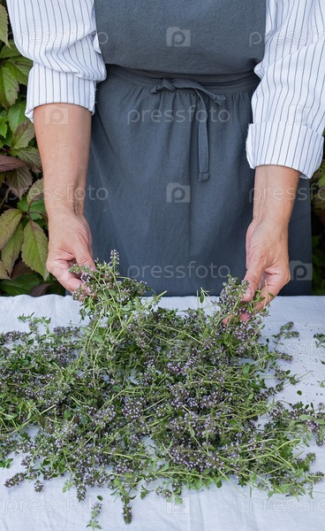Женщина раскладывает лекарственное растение тимьян на столе для сушки. Вертикальный урожай. Крупный план