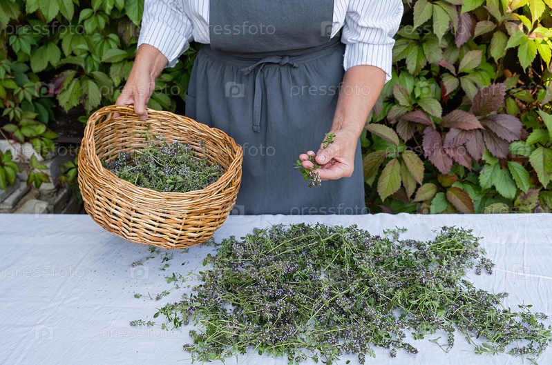 Женщина подготавливает лекарственное растение чабрец к сушке