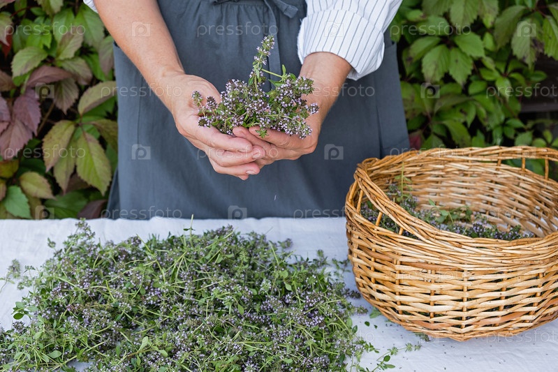 Женщина держит в руках лекарственное растение чабрец. Крупный план