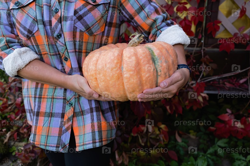 Осенний урожай: Держу тыкву. Крупный план