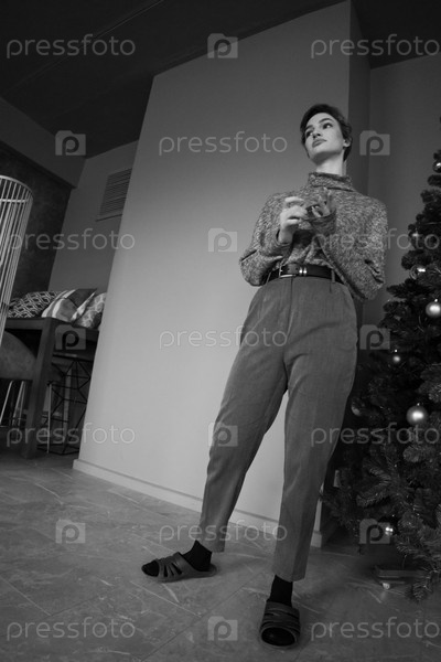 Молодая красивая женщина позирует в сером свитере в студии