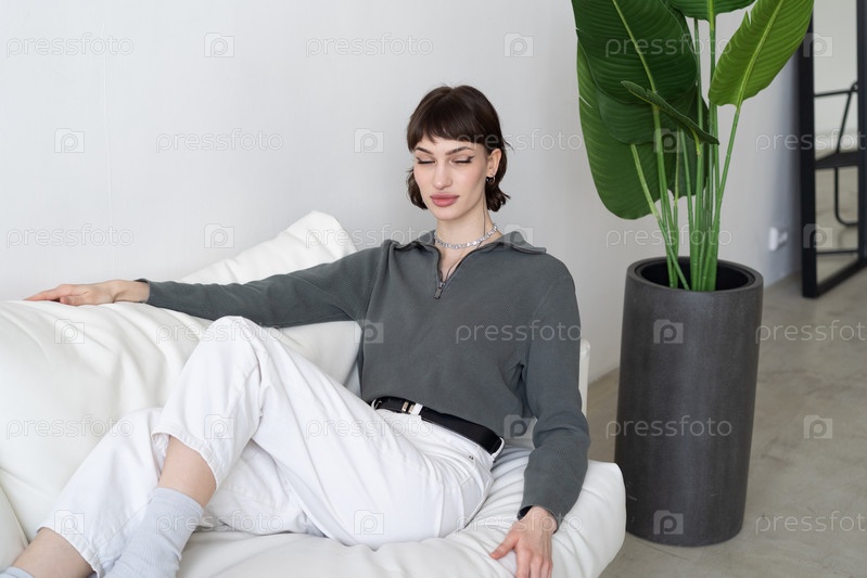 Молодая красивая женщина сидит в белых джинсах в студии