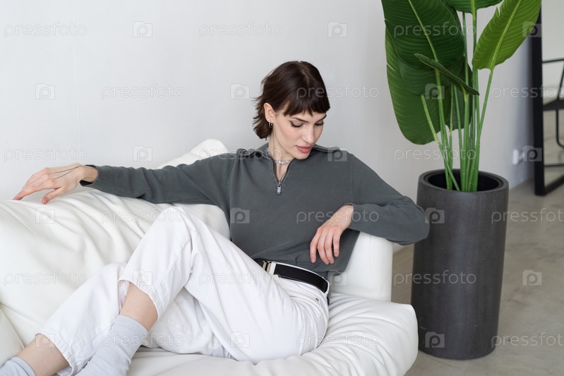Молодая красивая женщина сидит в белых джинсах в студии