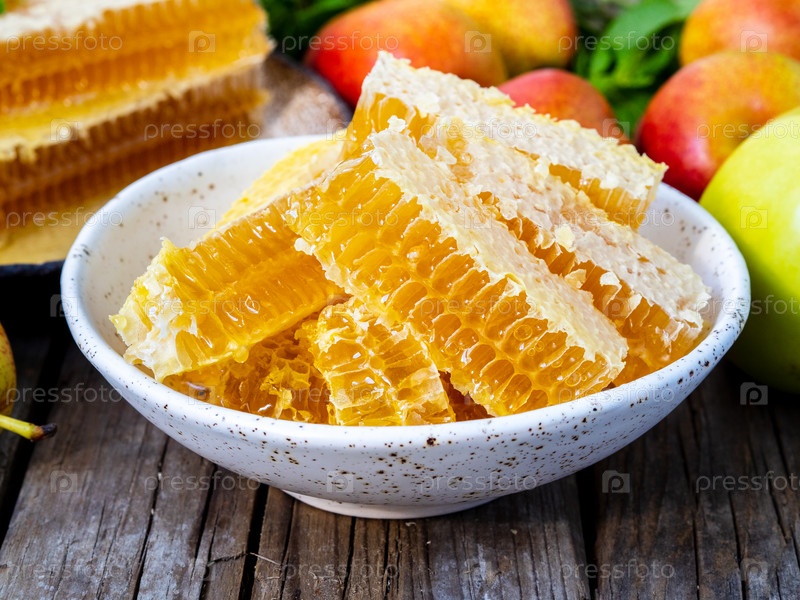 Мед в сотах, крупный план, на белой керамической тарелке, на деревянном деревенском столе, вид сбоку, солнечный свет