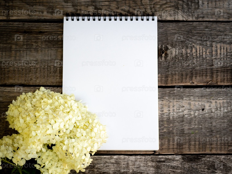Белый открытый пустой блокнот и букет цветов нежно-фиолетовой гортензии на старинном деревянном сером фоне, макет