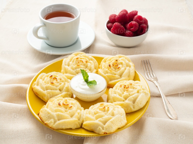 Диетические сырники, в форме розы, на желтой тарелке с чаем, малина на текстильной льняной салфетке, вид сбоку. Диетический завтрак