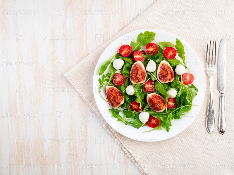 Свежий салат с инжиром, помидорами, огурцами, рукколой, моцареллой. Масло со специями,