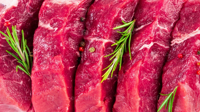 Фон из свежих сырых нарезанных говяжьих стейков, чеснока, розмарина и приправ. Сочный мясной баннер