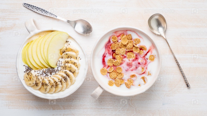 Два греческих йогурта с джемом, яблоком, мюсли, семенами чиа и бананом в белой миске на белом деревянном столе, вид сверху, баннер