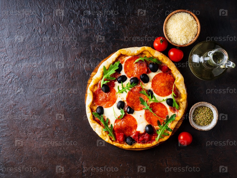 Горячая домашняя итальянская пицца пепперони с салями, моцареллой и оливками на темно-коричневом каменном столе, вид сверху, место для копирования