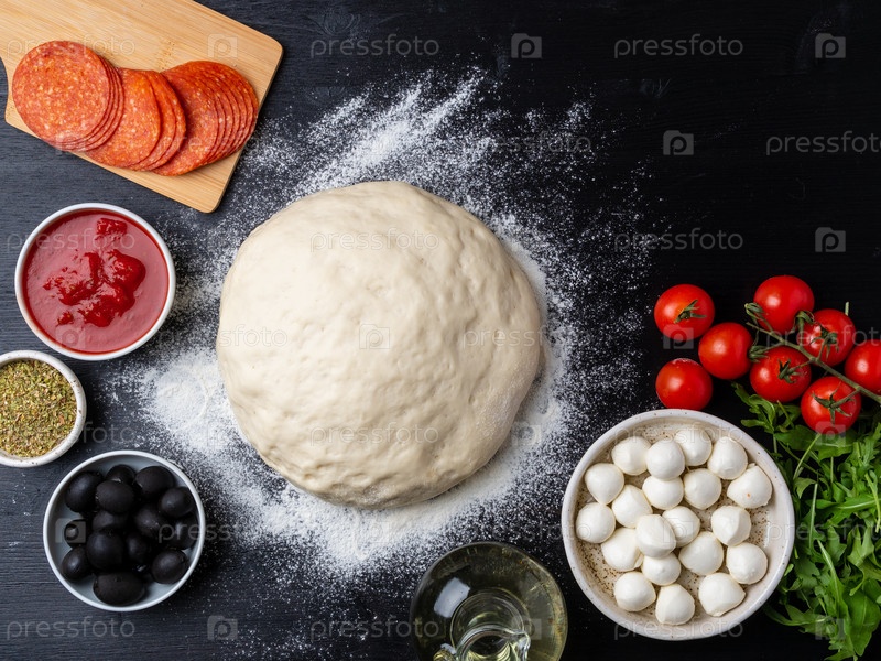 Сырое тесто для пиццы с ингредиентами и специями на темном черном фоне, вид сверху,