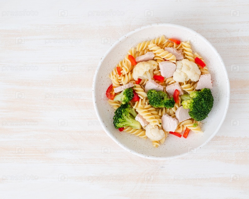 Паста фузилли с овощами, мясо индейки на белом деревянном столе, низкокалорийная диета, нежирная пища, вид сверху, место для копирования