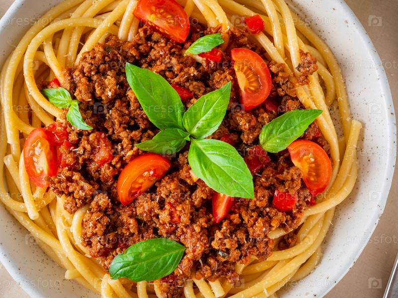 Паста болоньезе с томатным соусом, говяжьим фаршем, листья базилика на заднем плане