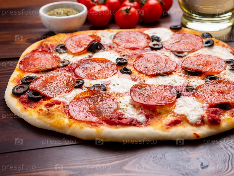 Горячая домашняя итальянская пицца пепперони с салями, моцареллой и оливками
