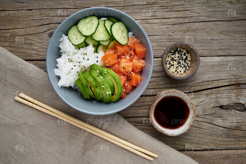 Поке из лосося со свежей рыбой, рисом, огурцом, авокадо с черным и белым кунжутом. Старый деревянный стол. Концепция еды