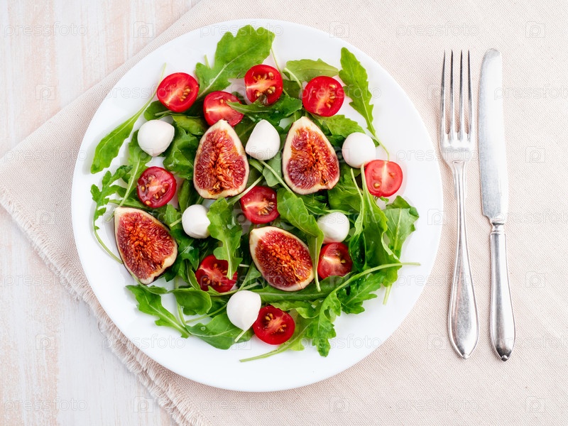 Свежий салат с инжиром, помидорами, огурцами, рукколой, моцареллой. Масло со специями,