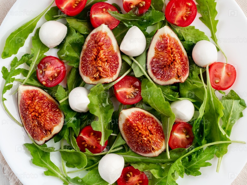 Свежий салат с инжиром, помидорами, огурцами, рукколой, моцареллой, маслом. вид сверху, макро крупным планом