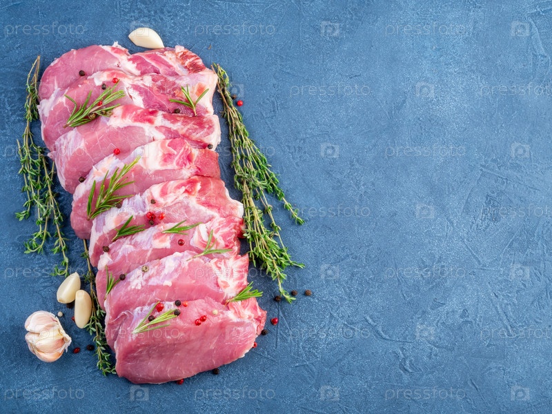 Свиной стейк, сырое филе карбоната на темном фоне, мясо с приправами, вид сверху, место для копирования