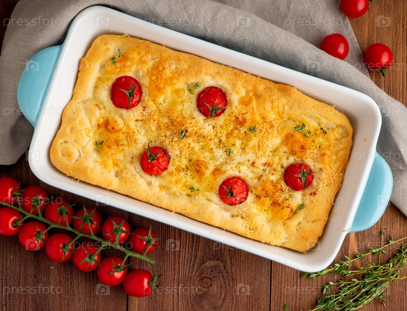 Аппетитная золотистая фокачча с томатами и специями на темном деревянном деревенском столе, вид сверху