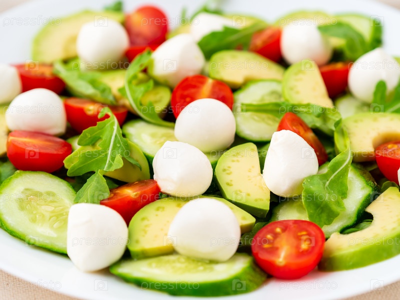 Свежий салат с помидорами огурцами рукколой моцареллой и авокадо. Масло со специями розмарин тимьян, вид сбоку, крупный план