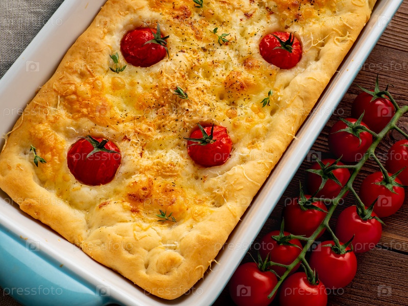 Часть аппетитной золотистой фокаччи с томатами и специями, на темном деревянном деревенском столе, вид сверху, крупный план