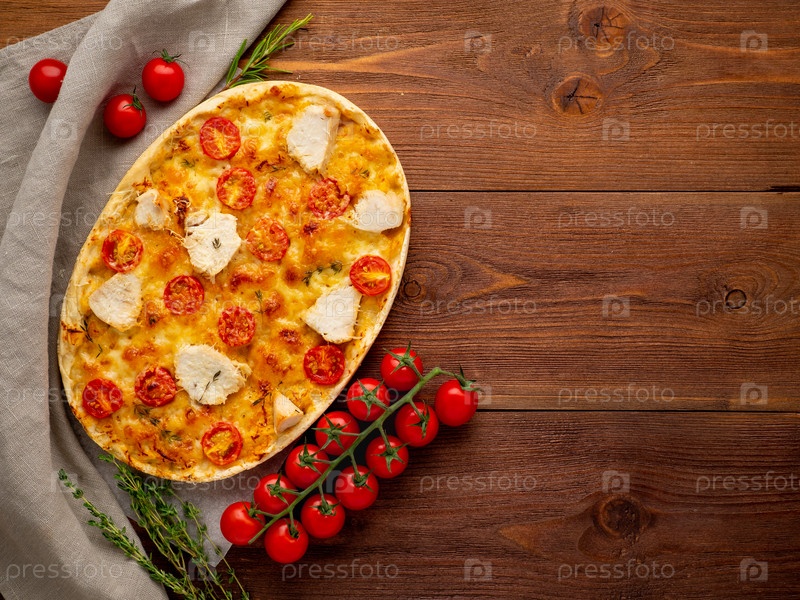 Аппетитная золотистая фокачча с помидорами, куриным мясом, специями на темном деревянном деревенском столе