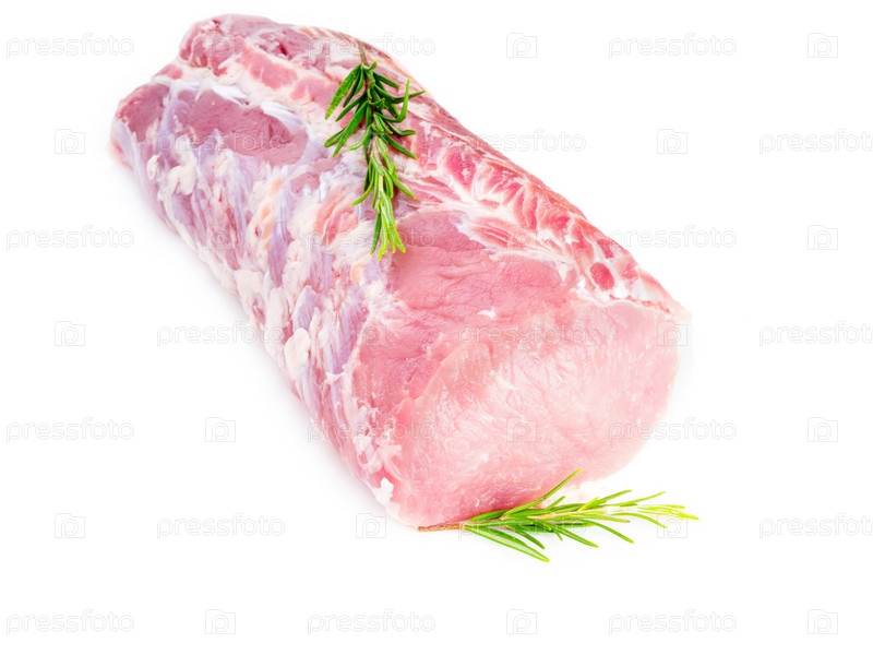 Большой кусок мяса, сырое филе свинины, изолированное на белом фоне, с розмарином
