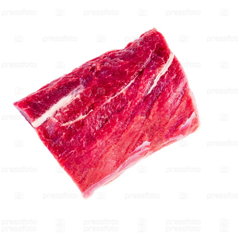 Большой кусок мяса, сырое филе говядины, изолированное на белом фоне. Стриплойн, вид сверху