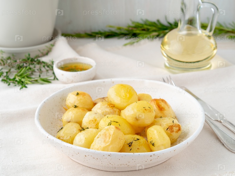Запеченные в духовке со специями круглые целые клубни картофеля в тарелке на белом текстильном фоне, золотистые с корочкой, вид сбоку
