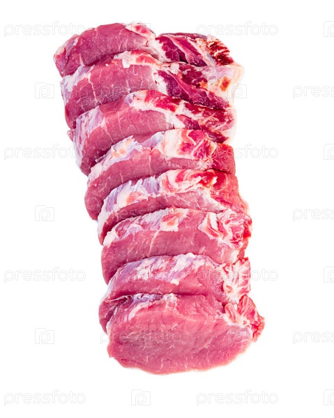 Ломтики свинины, корейка, изолированные на белом фоне, вид сверху, вертикальный