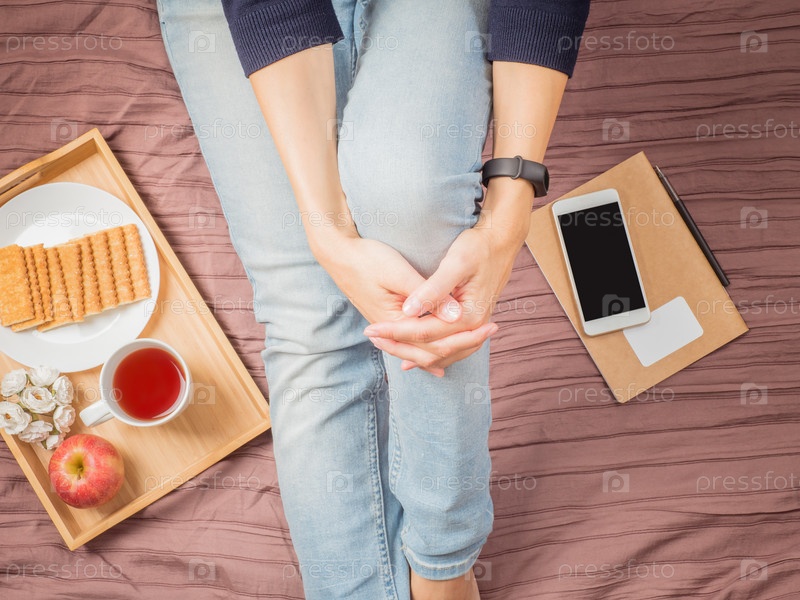 Плоская планировка женщины в джинсах, сидящей на кровати, обхватив колени, со смартфоном в руках