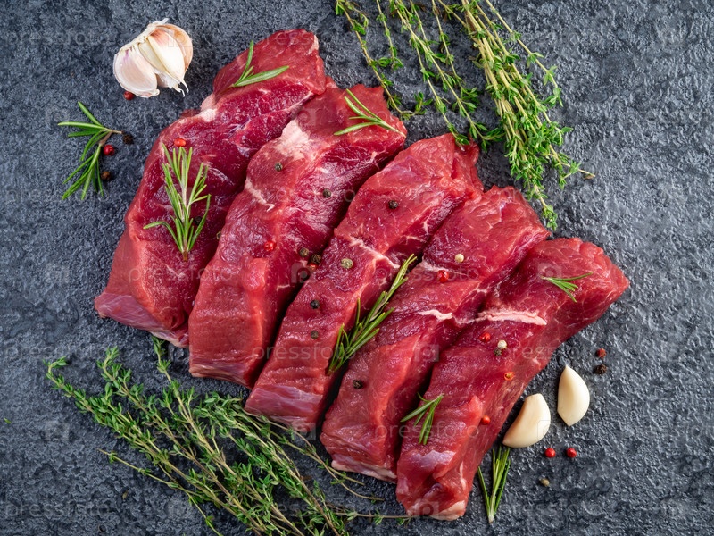 Сырое мясо, говяжий стейк с приправами на черном каменном столе, вид сверху