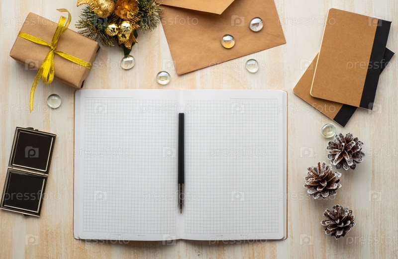Белый открытый блокнот, крафт-конверт и рождественское украшение на бежевом деревянном фоне
