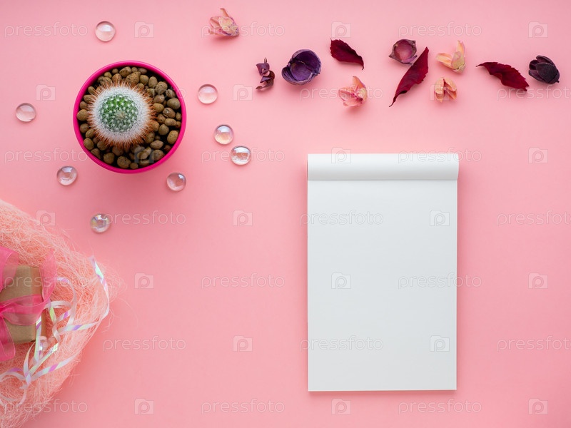 Сочный цветок, блокнот, сухие листья и подарочная коробка на ярко-розовом фоне, вид сверху, место для копирования, плоская планировка