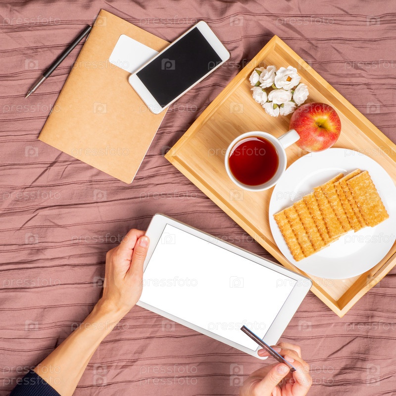Женщина лежит на кровати, пьет чай и смотрит в планшет, оплачивает покупки, совершает покупки в интернете