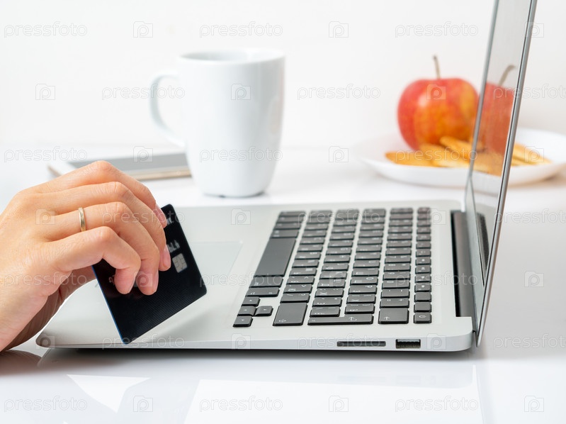 Женщина сидит за столом дома и смотрит в ноутбук, оплачивает покупки кредитной картой, онлайн