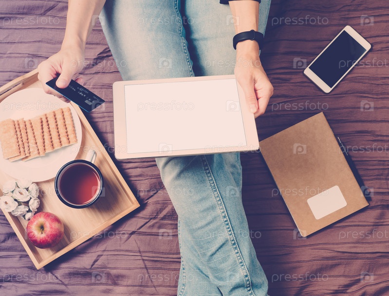 Женщина сидит на кровати, пьет чай и смотрит в планшет, платит за покупки, интернет-магазины