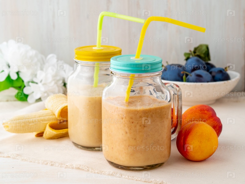 Бананово-персиковый нектариновый смузи в двух банках, свежие фруктовые молочные коктейли на белом деревенском деревянном столе, вид сбоку
