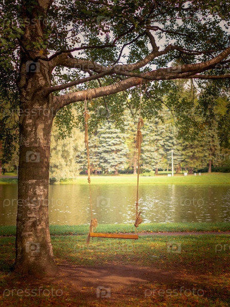 Самодельные качели из доски и каната на дереве в парке или саду, никого, пустое пространство, осенний фон